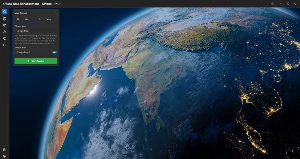 なお、どの地図をベースに表示するかの選択もしておく必要があります。Google MapやBing map等が選べますがGoogle Mapあたりが安定して良いでしょう。それでは必要なものを導入し準備が出来たところでX-Plane12を起動しますが、ここで注意する事はX-Plane12本体を起動する前にMEをまず立ち上げることです。そして、HOME画面にある緑色のStart Serviceボタンを押します。その後にX-Plane12を立ち上げるのですがX-Plane12のアイコンから起動するのではなくMEにあるRun Gameボタンを押すとX-Plane12が立ち上がります。この方法でゲームをスタ-トしないとMEが機能しないようです。この辺りはAutoOrthoと似ていますね。