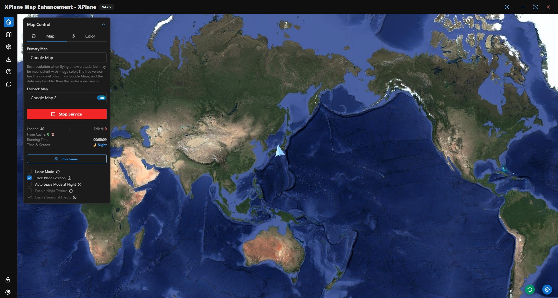 なお、どの地図をベースに表示するかの選択もしておく必要があります。Google MapやBing map等が選べますがGoogle Mapあたりが安定して良いでしょう。それでは必要なものを導入し準備が出来たところでX-Plane12を起動しますが、ここで注意する事はX-Plane12本体を起動する前にMEをまず立ち上げることです。そして、HOME画面にある緑色のStart Serviceボタンを押します。その後にX-Plane12を立ち上げるのですがX-Plane12のアイコンから起動するのではなくMEにあるRun Gameボタンを押すとX-Plane12が立ち上がります。この方法でゲームをスタ-トしないとMEが機能しないようです。この辺りはAutoOrthoと似ていますね。